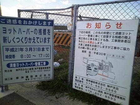 須磨ヨットハーバーの改修工事の看板が立てられており、