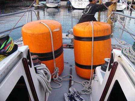 大型たるフェンダーを運びいれ、家から持参したエアーコンプレッサーで八世に積まれているへこんだフェンダーを膨らます作業をしました。おとん、ちょこちょこ道具借りてすみません。
